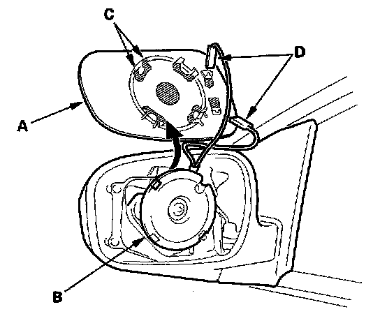 2. Separate the mirror holder from the actuator (B) by slowly pulling them apart while detaching the clips (C). If equipped, disconnect the mirror defogger connectors (D) from the heater pad terminals.