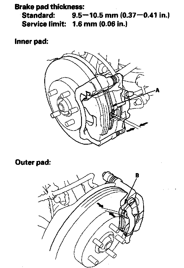 2. Check the thickness of the inner pad (A) and outer pad (B). Do not include the thickness of the brake pad backing plate.