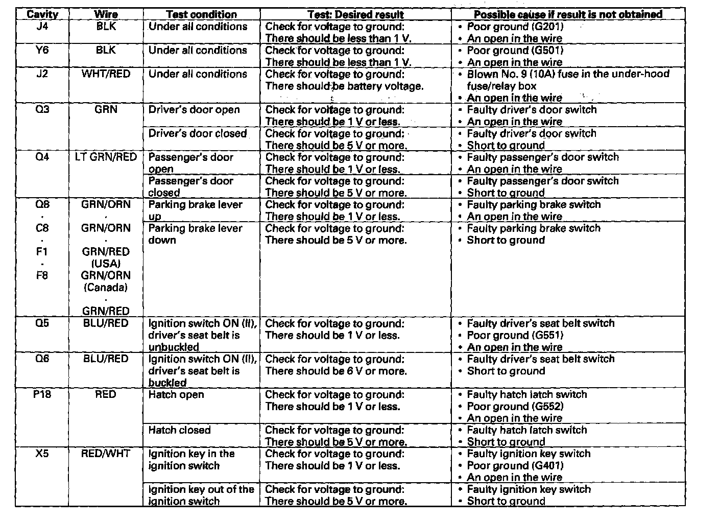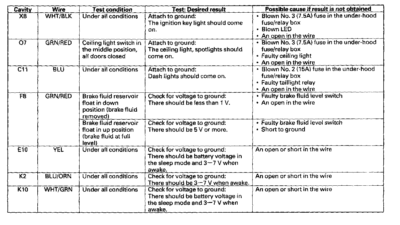 4. Reconnect the connectors to the under-dash fuse/relay box, turn the ignition switch ON (II) to keep the system awake and make sure these input tests at the appropriate connectors on the under-dash fuse/relay box.