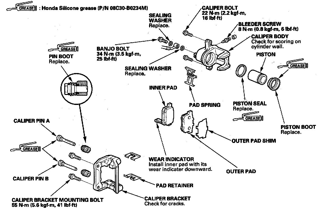 Remove, disassemble, inspect, reassemble, and install the caliper, and note these items: