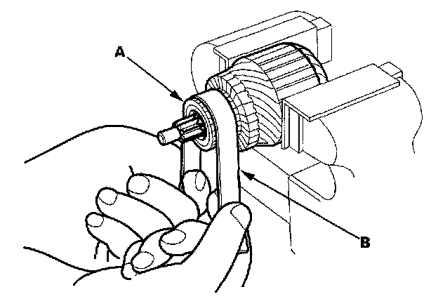 4. Check the commutator (A) surface. If the surface is dirty or burnt, resurface with emery cloth or a lathe within the given specifications, or recondition with # 500 or # 600 sandpaper (B).