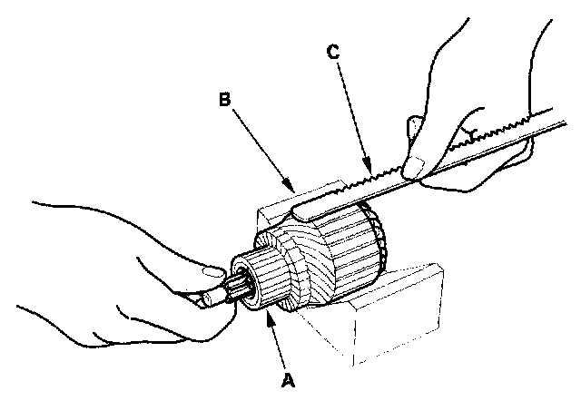 9. Place the armature (A) on an armature tester (B). Hold a hacksaw blade (C) on the armature core. If the blade is attracted to the core or vibrates while the core is turned, the armature is shorted. Replace the armature.