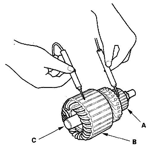 10. Check with an ohmmeter that no continuity exists between the commutator (A) and armature coil core (B), and between the commutator and armature shaft (C). If continuity exists, replace the armature.