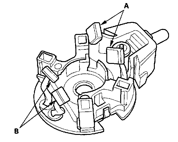 12. Check that there is no continuity between the (+) brush (A) and (-) brush (B). If there is continuity, replace the brush holder assembly.