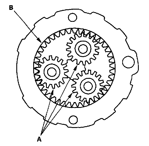 13. Check the planetary gears (A) and ring gear (B). Replace them if they are worn or damaged.