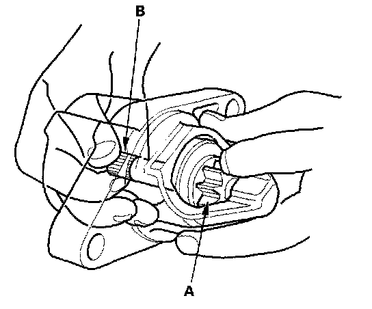 14. Holding the drive gear (A), turn the gear shaft (B) clockwise. Check that the drive gear comes out to the other end. If the drive gear does not move smoothly, replace the gear cover assembly.
