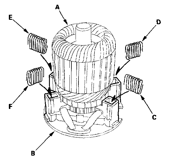 18. Squeezing a spring (C), insert it in the hole on the brush holder, and push it until it bottoms. Repeat this for the other three springs (D, E and F).