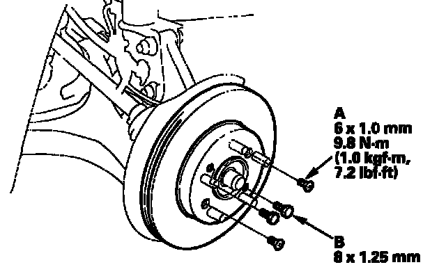 7. Screw two 8 x 1.25 mm bolts (B) into the disc to push it away from the hub. Turn each bolt two turns at a time to prevent cocking the disc excessively.