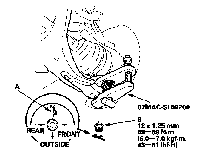 10. Remove the lock pin (A) from the lower arm ball joint, and remove the castle nut (B).