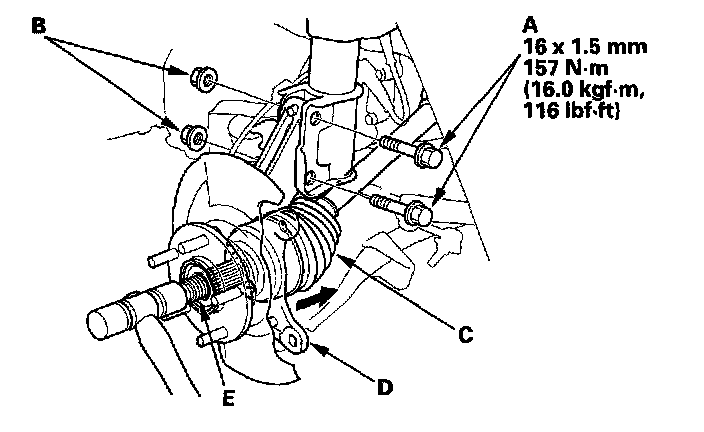 1. Separate the hub (A) from the knuckle (B) using the special tool and a hydraulic press. Hold the knuckle with the attachment (C) of the hydraulic press or equivalent tool. Be careful not to deform the splash guard. Hold onto the hub to keep it from falling when pressed clear.