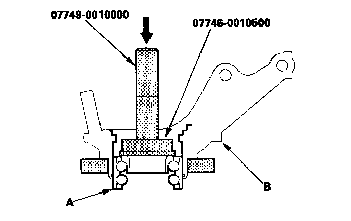 4. Press the wheel bearing (A) out of the knuckle (B) using the special tool and a press.