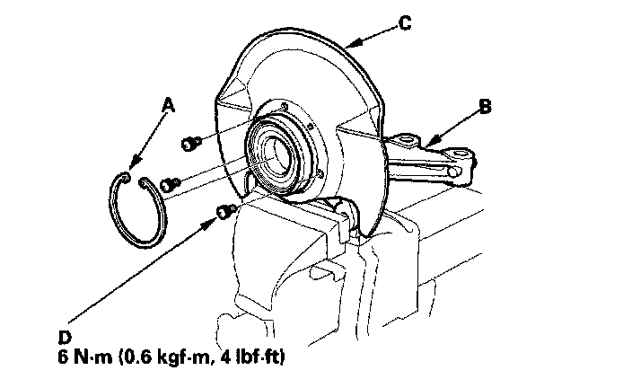 6. Press a new wheel bearing (A) into the knuckle (B) using the old bearing (c), a steel plate (D), the special tool, and a press.