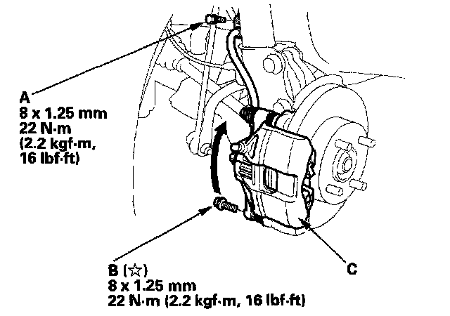 2. Remove the bolt (B) and pivot the caliper (C) up out of the way. Check the hose, pin boot, and sleeve boots for damage and deterioration.