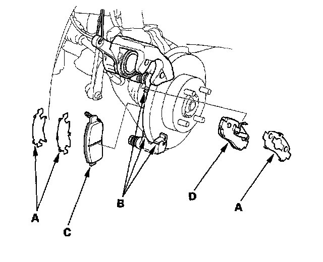 3. Remove the pad shims (A), pad retainers (B), and inner pad (C) and outer pad (D).