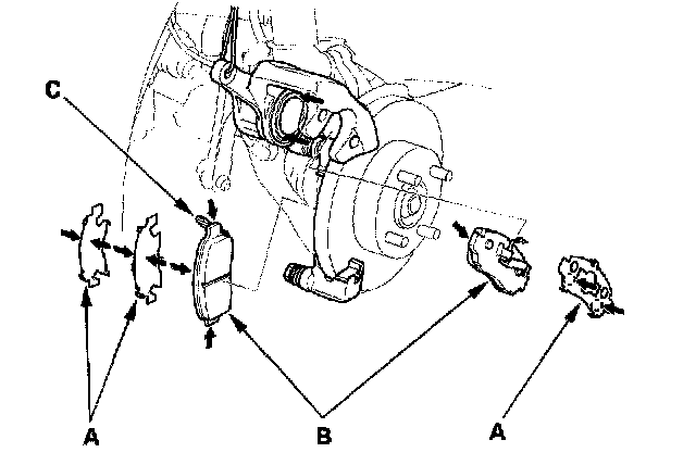 8. Install the brake pads and pad shim correctly. Install the brake pad with the wear indicator (C) on the upper inside.