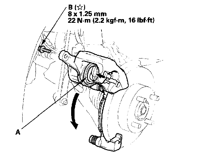 10. Pivot the caliper down into position. Being careful not to damage the pin boot, install the bolt (B), and tighten it to the specified torque.