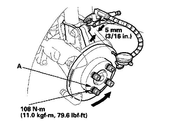 4. Install suitable flat washers (A) and wheel nuts, and tighten the nuts to the specified torque to hold the brake disc securely against the hub.