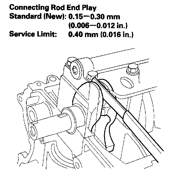 2. Measure the connecting rod end play with a feeler gauge between the connecting rod and crankshaft.
