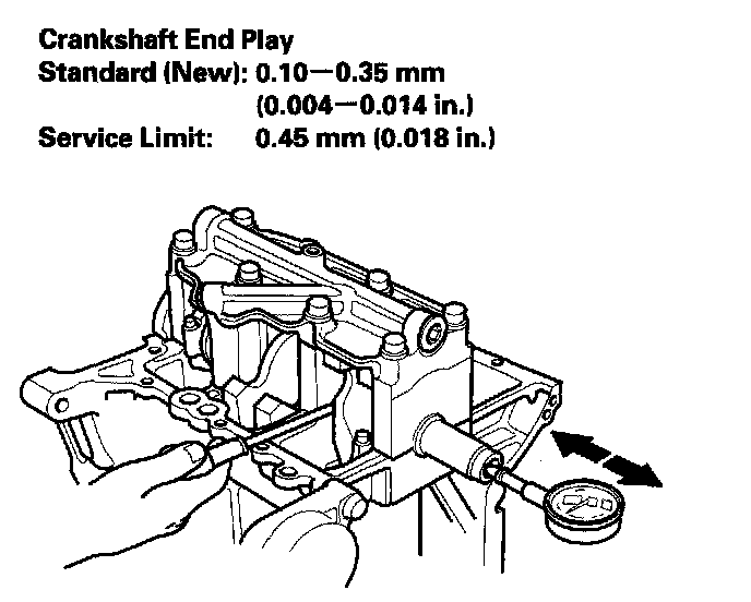 4. Push the crankshaft firmly away from the dial indicator, and zero the dial against the end of the crankshaft. Then pull the crankshaft firmly back toward the indicator; the dial reading should not exceed the service limit.