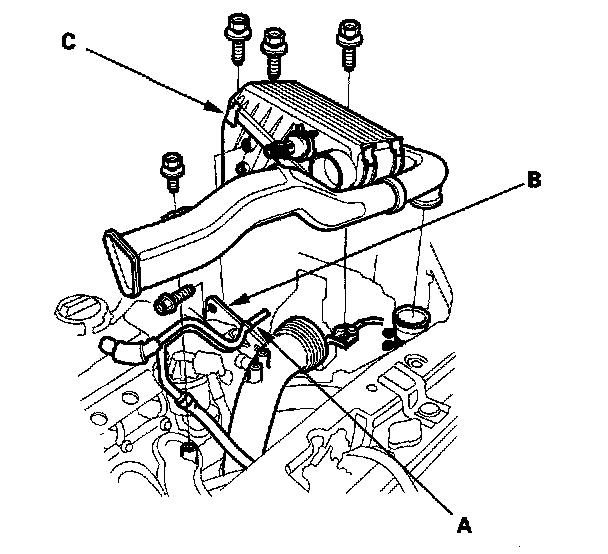 35. Install the air cleaner housing/intake air duct assembly (A), then install the breather pipe (B) and brake booster vacuum hose bracket (C) on the air cleaner housing.