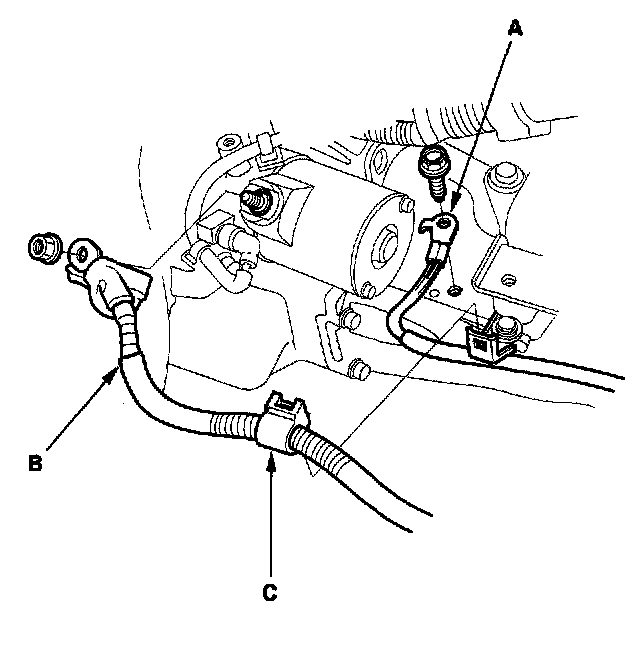 11. Remove the ground cable (A), starter cable (B), and harness clamp (C).
