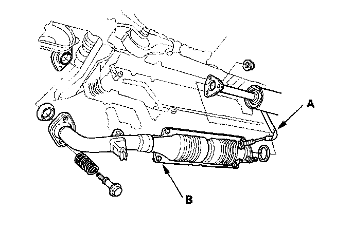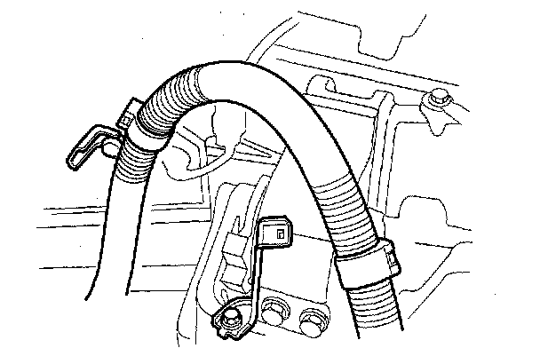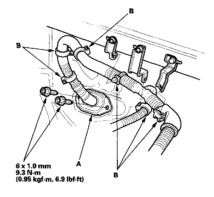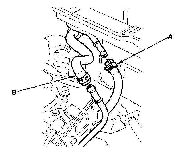 10. Remove the brake booster vacuum hose (A) and the evaporative emission (EVAP) canister hose (B).