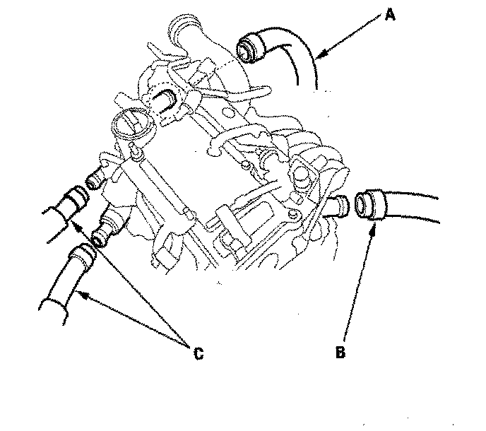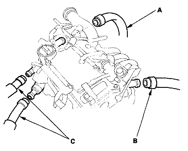 37. Remove the upper radiator hose (A), lower radiator hose (B), and heater hoses (C).