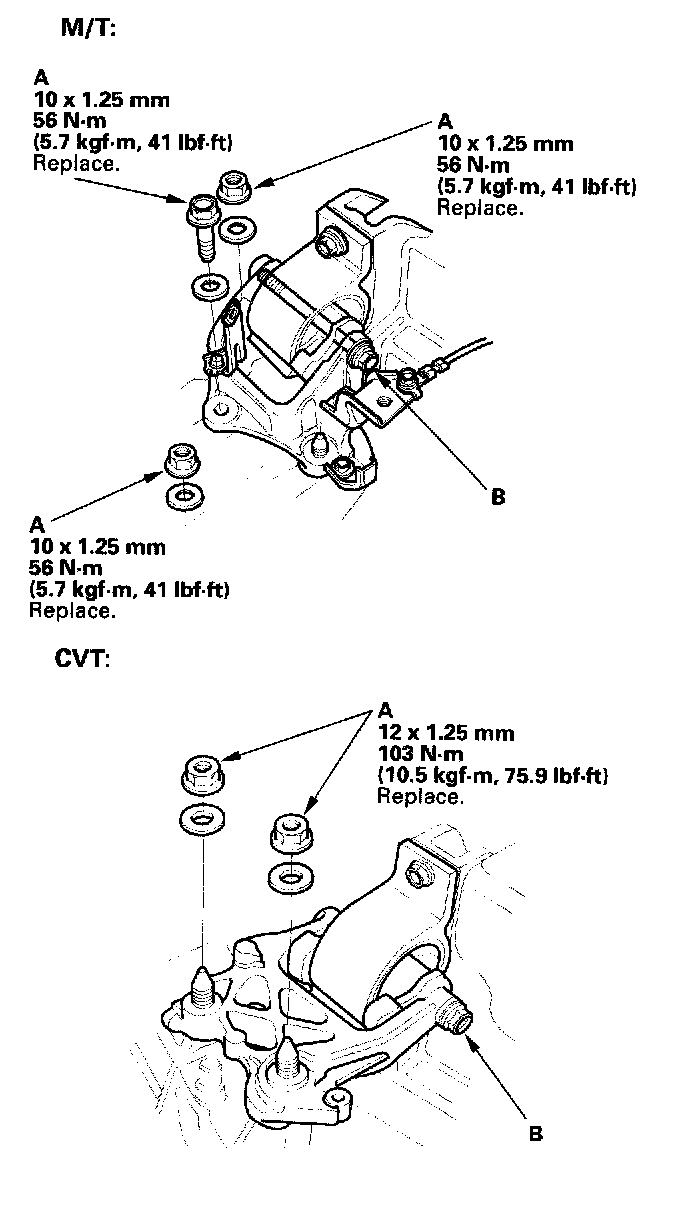 3. Tighten the transmission mount bracket mounting bolt/nuts (A), then loosen the transmission mount bolt (B).