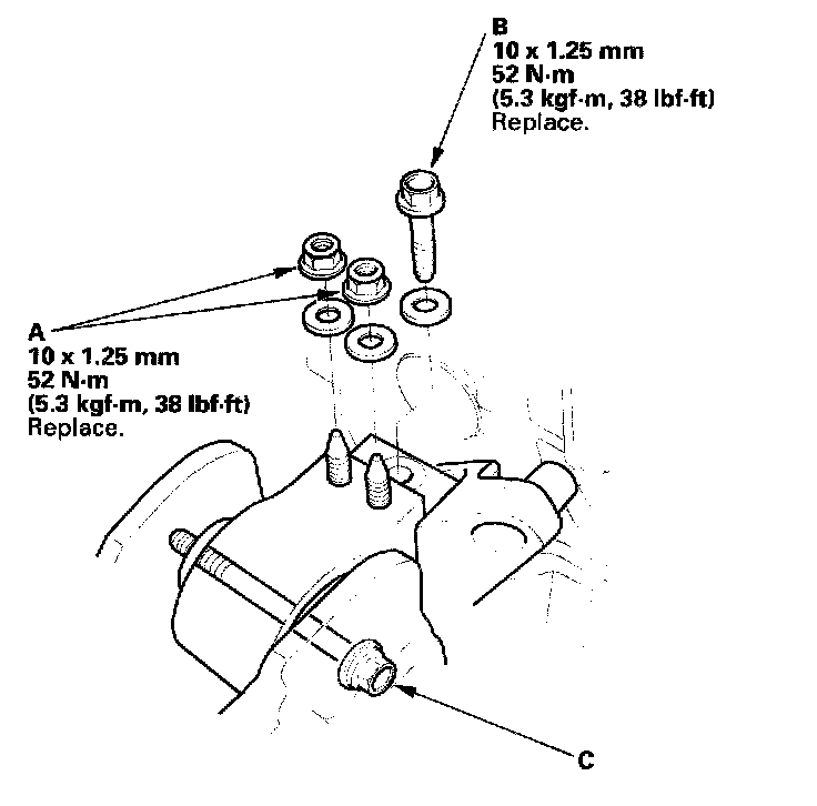 4. Tighten the side engine mount mounting nuts (A) and mounting bolt (B), then loosen the side engine mount bolt (C).