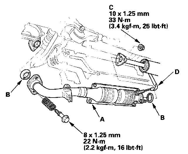 16. Install the NOx adsorptive three way catalyst (NOx adsorptive TWC) (A); use new gaskets (B) and new self-locking nuts (C), then connect the third heated oxygen sensor (third HO2S) connector (D) (2002-2005 M/T models).