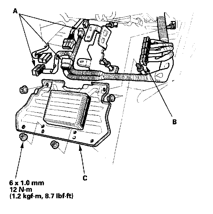 13. Remove the engine control module (ECM) cover (A), then disconnect the ECM connectors (B) and the main wire harness connectors (C).