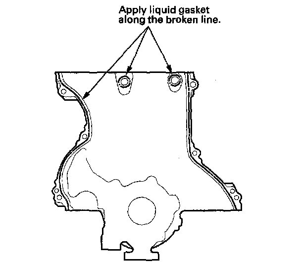 17. Apply liquid gasket, P/N 08717-0004, 08718-0001, or 08718-0002, to the cylinder head mating surface of the block and oil pump along the broken line.