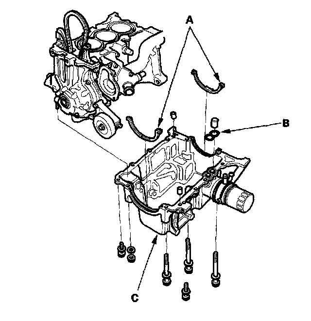 5. Install the dowel pins (A), then align the oil pump inner rotor with the crankshaft and install the oil pump (B) with a new O-rings (C).
