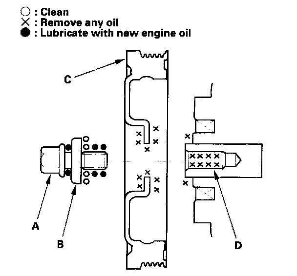 11. Clean the bolt (A), washer (B), crankshaft pulley (C) and crankshaft (D). Lubricate with new engine oil as shown.