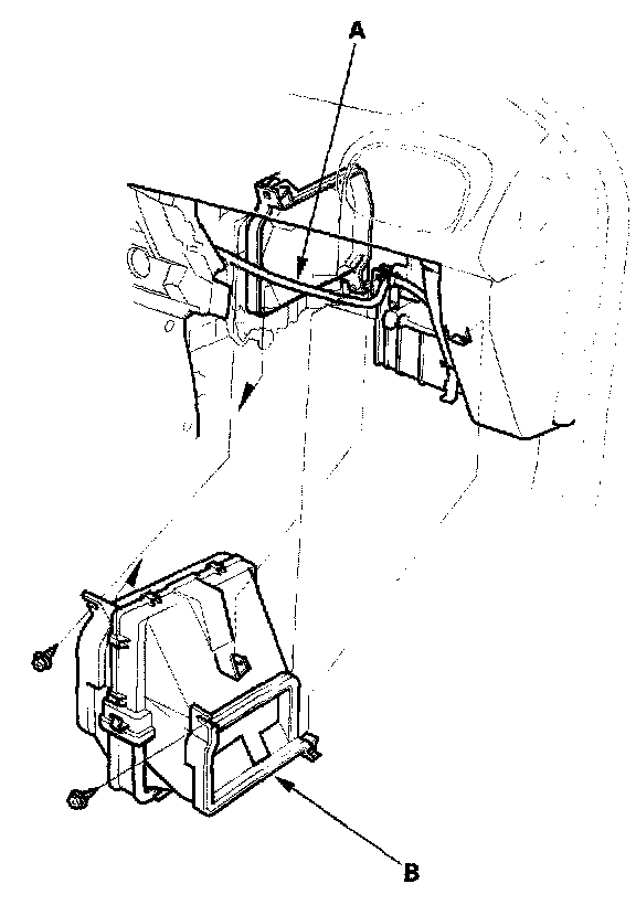 4. Remove the wire harness (A) from the heater duct (B), then remove the self-tapping screws and the heater duct.