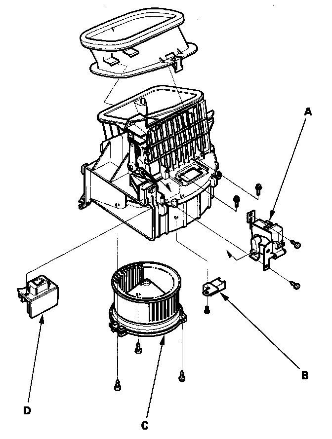 - The recirculation control motor (A), the blower motor high relay (B), the blower motor (C), and the power transistor (D) can be replaced without removing the blower unit.