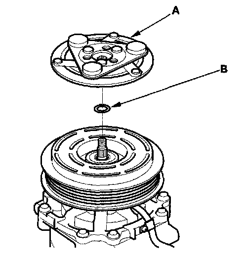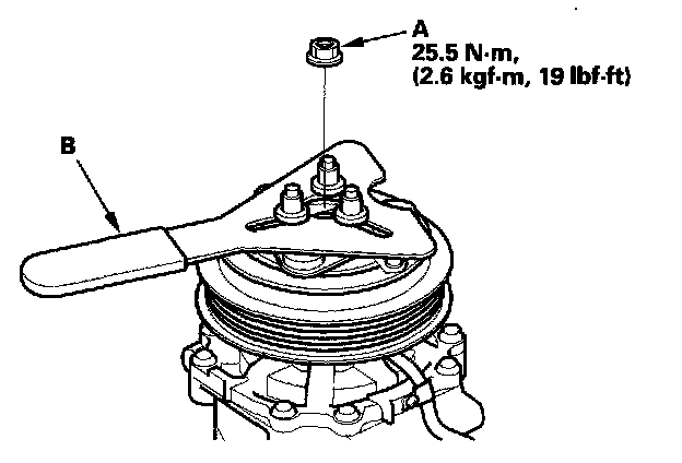 1. Remove the center nut (A) while holding the armature plate with the commercially available A/C clutch holder (B).