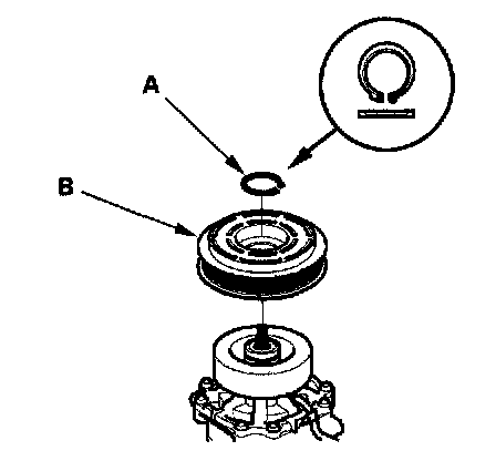 3. If you are replacing the field coil, remove the snap ring (A) with snap ring pliers, then remove the rotor pulley (B). Be careful not to damage the rotor pulley or the A/C compressor.