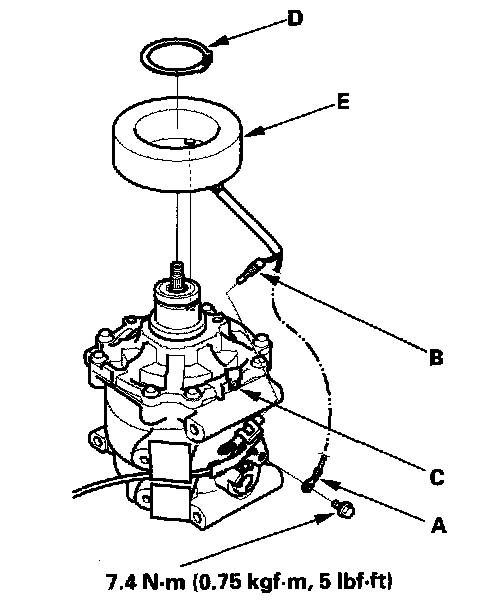 4. Remove the bolt and field coil ground terminal (A), then disconnect the field coil connector (B). Loosen the clamp screw (C) to free the field coil wire. Remove the snap ring (D) with snap ring pliers, then remove the field coil (E). Be careful not to damage the field coil or the A/C compressor.