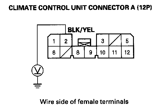 4. Measure the voltage between the No. 2 terminal of climate control unit connector A (12P) and body ground.