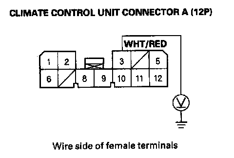 6. Measure the voltage between the No. 3 terminal of climate control unit connector A (12P) and body ground.