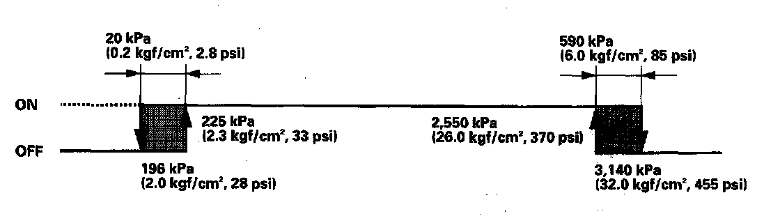 If the refrigerant pressure goes above 1,470 kPa (15.0 kgf/sq.cm, 213 psi), the A/C pressure switch closes to signal the ECM to change the speed of the A/C condenser fan and radiator fan (high). When the pressure drops to 1,080 kPa (11.0 kgf/sq.cm, 156 psi) the switch opens and funs return to low speed.