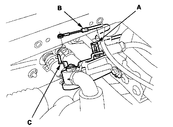 Heater Valve Cable Adjustment1. From under the hood, open the cable clamp (A), then disconnect the heater valve cable (B) from the heater valve arm (C).