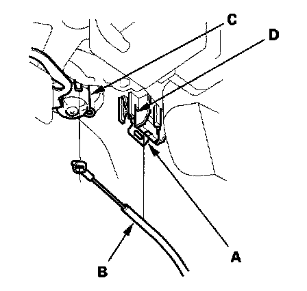 4. Attach the heater valve cable (B) to the air mix control linkage (C) as shown. Hold the end of the heater valve cable housing against the stop (D), then snap the heater valve cable housing into the cable clamp (A).