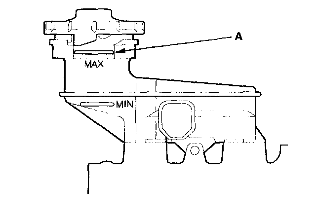 1. Make sure the brake fluid level in the reservoir is at the MAX (upper) level line (A).