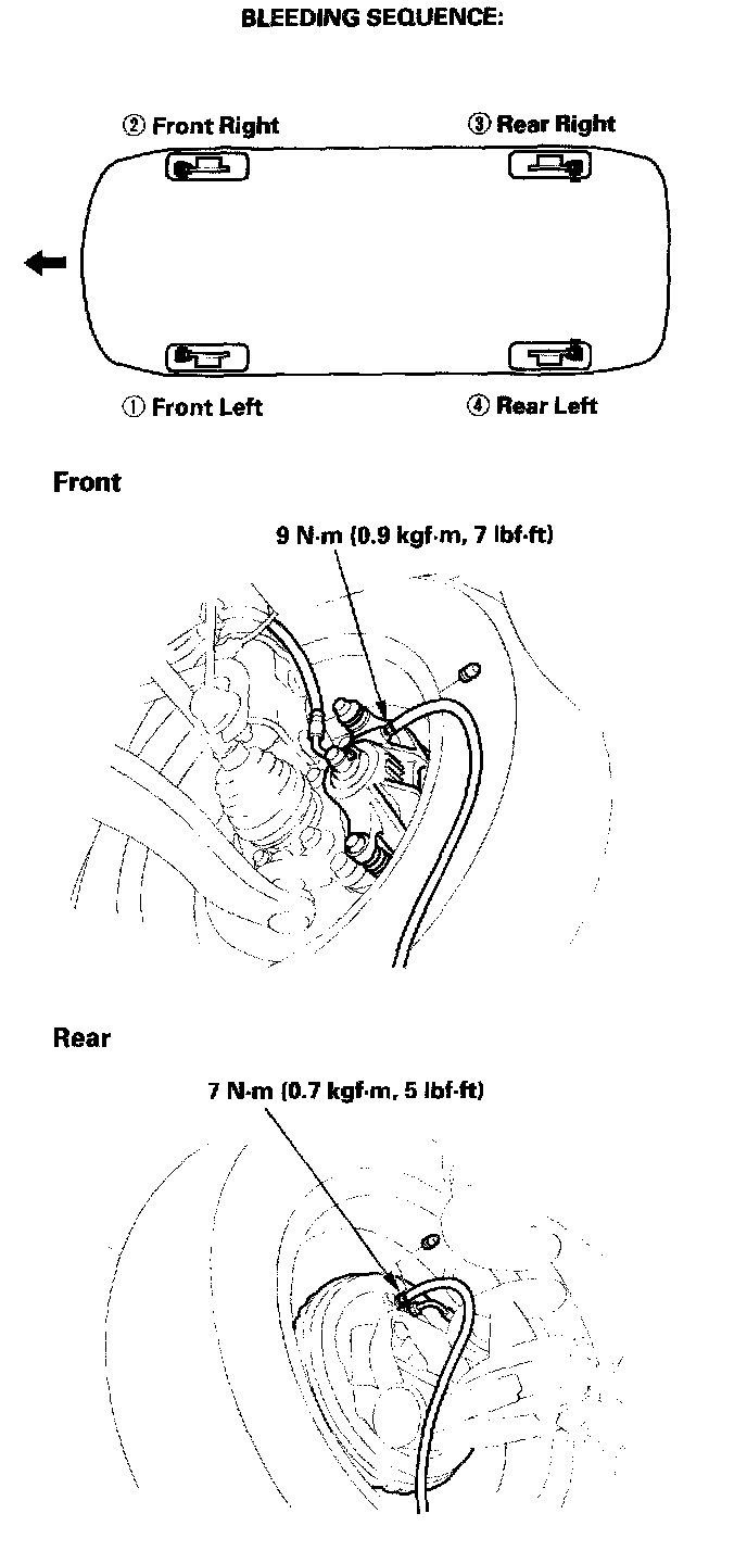 4. Repeat the procedure for each wheel in the sequence shown following until air bubbles no longer appear in the fluid.