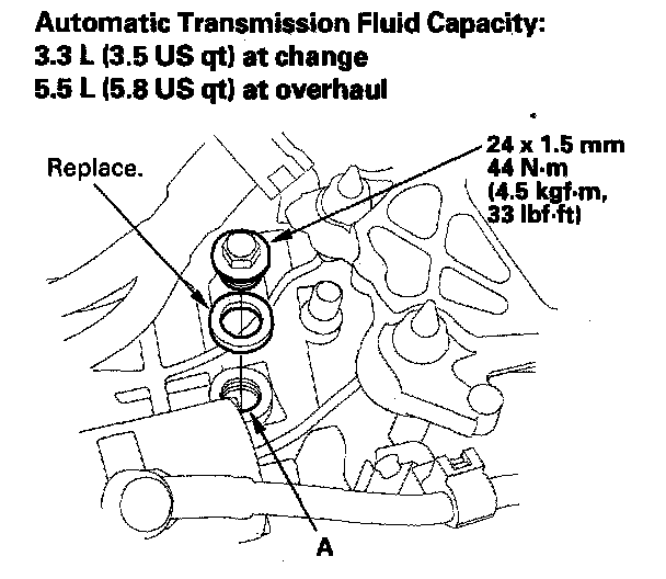 4. Remove the drain plug (A), and drain the automatic transmission fluid (ATF).