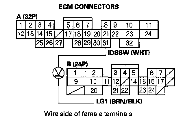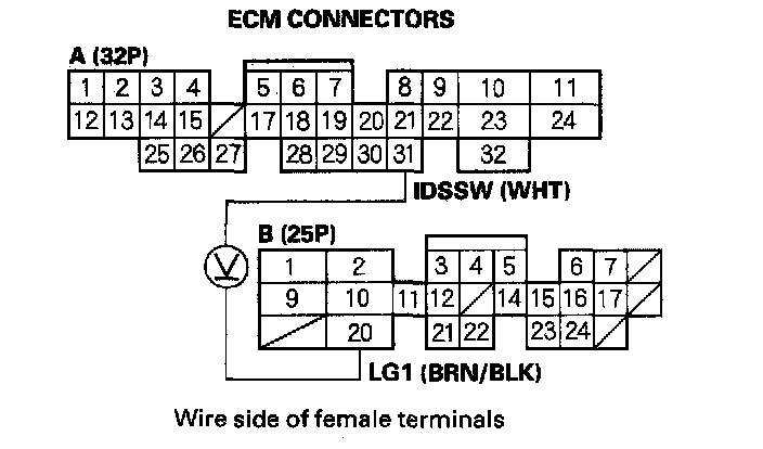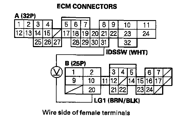 6. Measure voltage between ECM connector terminals A31 and B20.