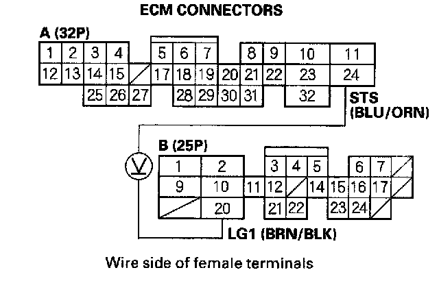 Starter Switch Signal Circuit Troubleshooting1. Measure voltage between ECM connector terminals A24 and B20 with the ignition switch in the start position (III) and the clutch pedal pressed.