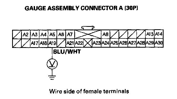 18. Connect a voltmeter between the BLU/WHT wire and body ground.